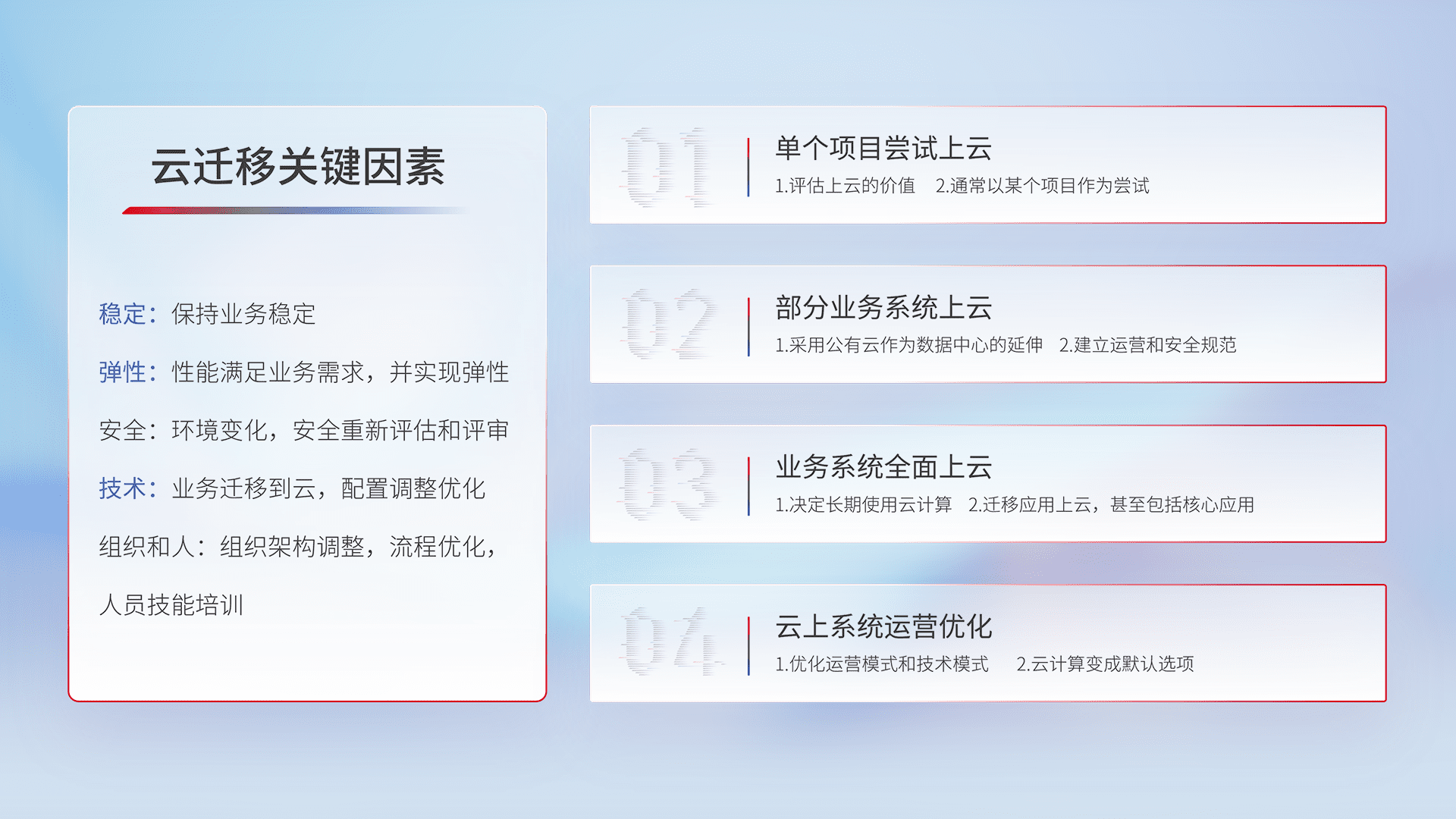 结合实际业务,,,,从规划设计、、、、云平台选型、、、云原生改造、、数据迁移、、集成交付,,,迁移全过程为客户识别最佳上云路径,,,做好风险识别管理,,,,设计网络架构、、身份权限、、、安全审计合规、、操作审计、、日志审计、、监控告警策略、、、多站点容灾设计等,,,对云上基础设施进行整体规划,,,,提升IT治理水平,,,,以满足弹性、、、、高可用、、、、高性能的需求。。