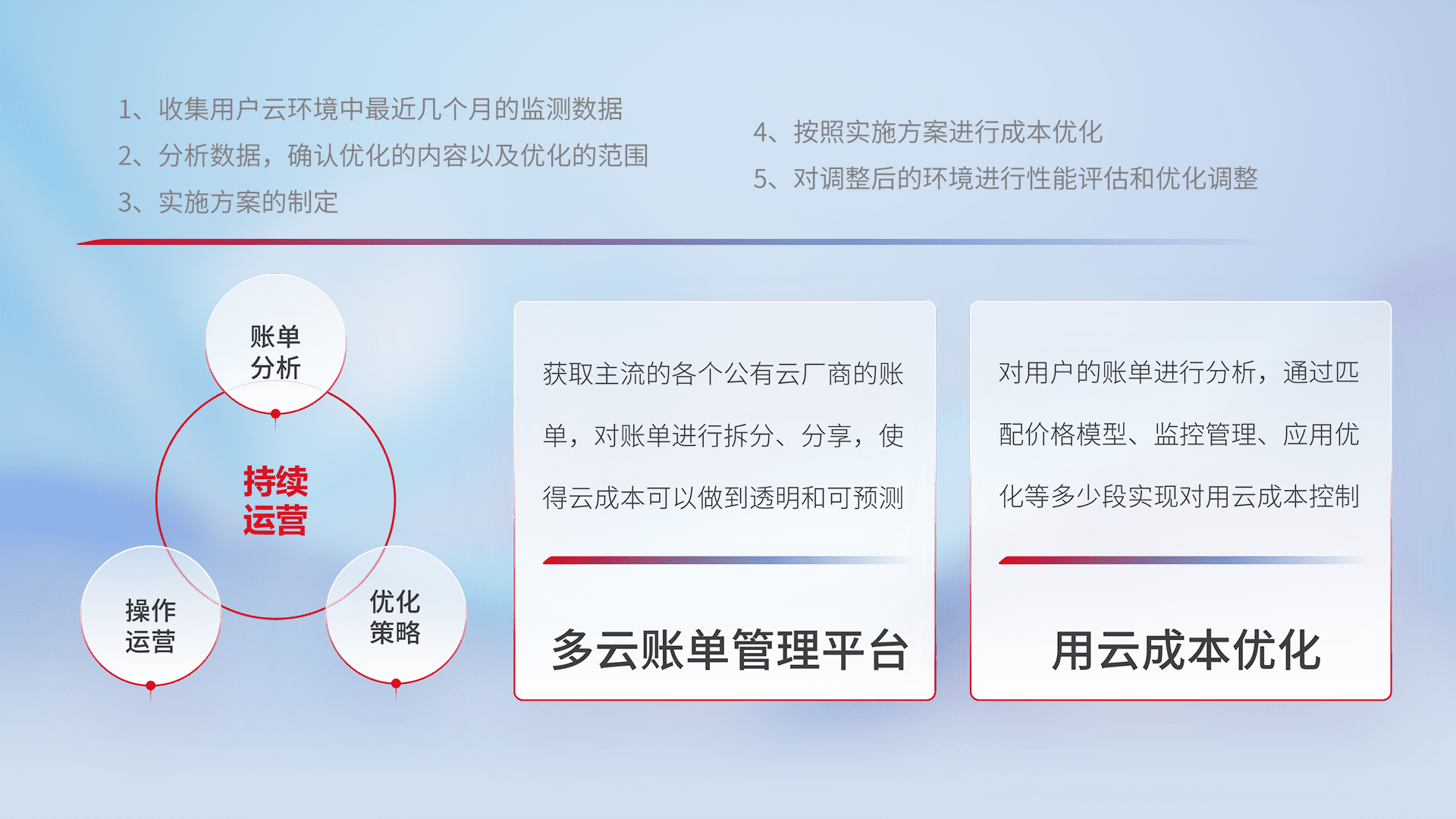通过多云纳管,,以统一的资源数据模型把客户的云资源进行抽象和封装,,,进而实现对多云资源的统一操作,,,,保障云资源管理的可靠性、、、稳定性与可用性。。。。量身定制化运维内容,,,,配置、、、、开发运维、、补丁管理、、、备份、、、监控、、认证和访问管理、、、、审计和日常巡检等,,,保障在用云过程中的可靠度,,,,稳定度以及高可用率。。。。