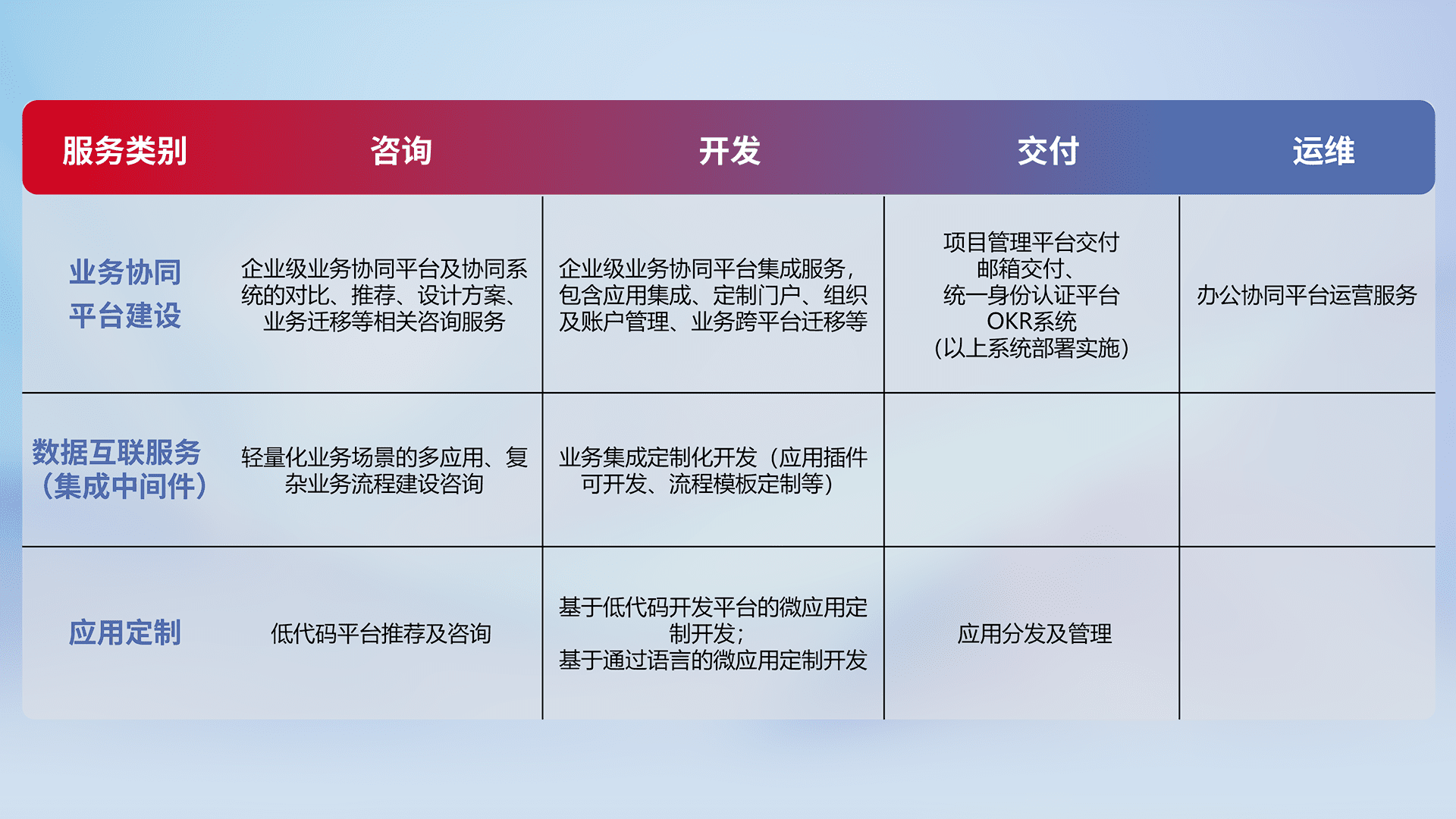 针对钉钉、、、、企微、、、、IDaas等平台级产品提供产品的规划、、、方案、、交付、、定制化开发等服务,,,,实现如统一协同办公、、、智能客户服务、、混合会议管理、、、、智能数据查询、、等业务场景,,实现数字化转型。。